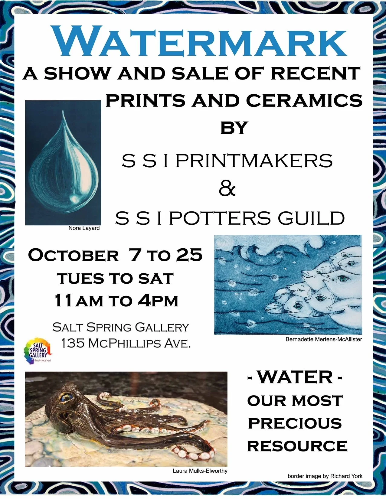 Watermark October 5, 2022 Salt Spring Gallery ~ A Show And Sale of Recent prints and ceramics by SSI Printmakers and SSI Potters guild.